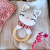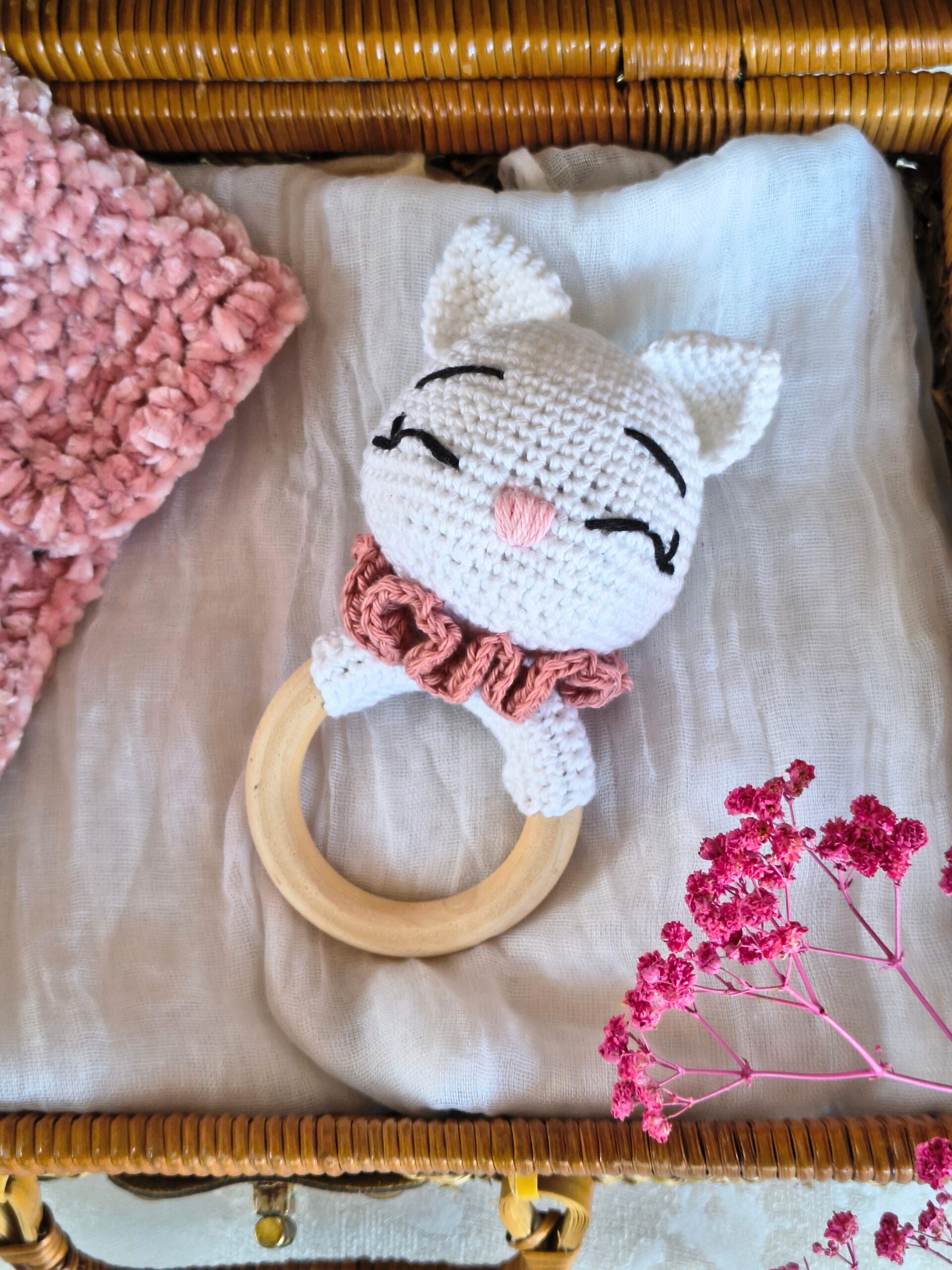 Chocalho Mia Gatinha: som suave e anel de madeira natural.