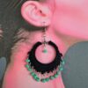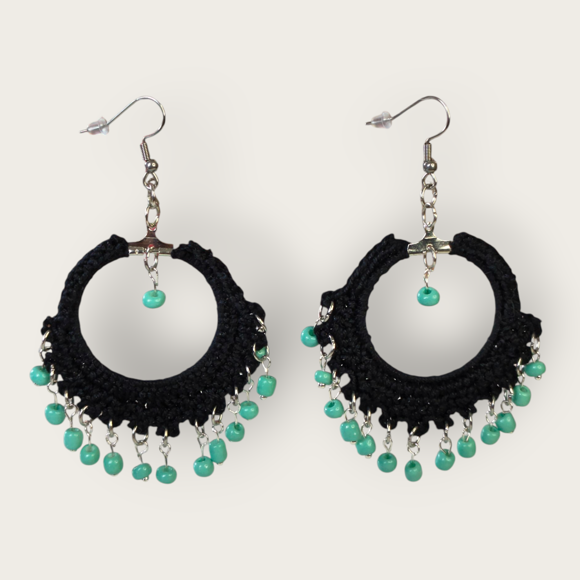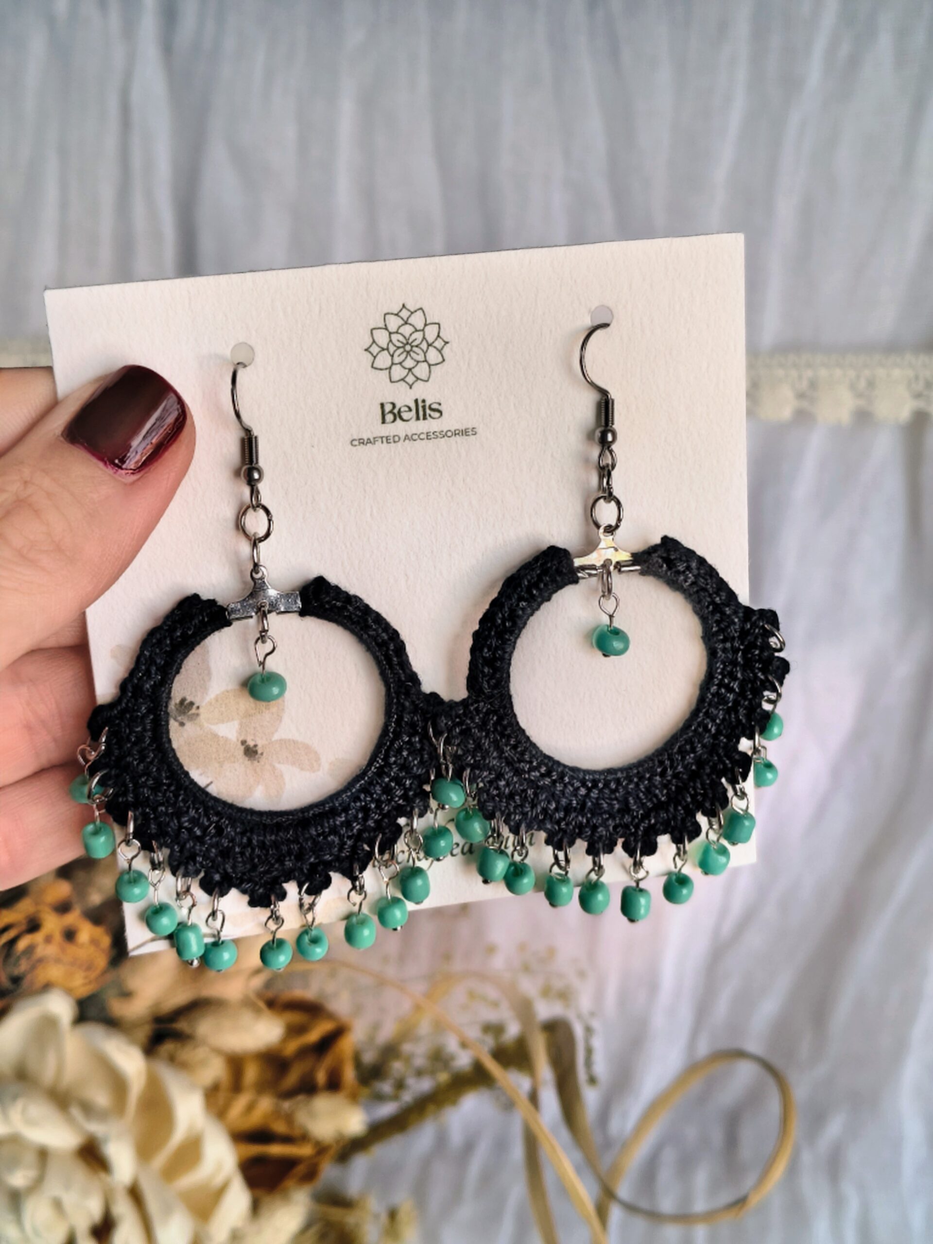 Os brincos Bohemia são a expressão máxima do estilo boho chic. Longos e pendentes, combinam uma argola elegante com croché preto e missangas turquesas, criando um contraste vibrante e sofisticado. A base em aço inoxidável com acabamento prateado assegura durabilidade e conforto, tornando-os perfeitos para uso prolongado.