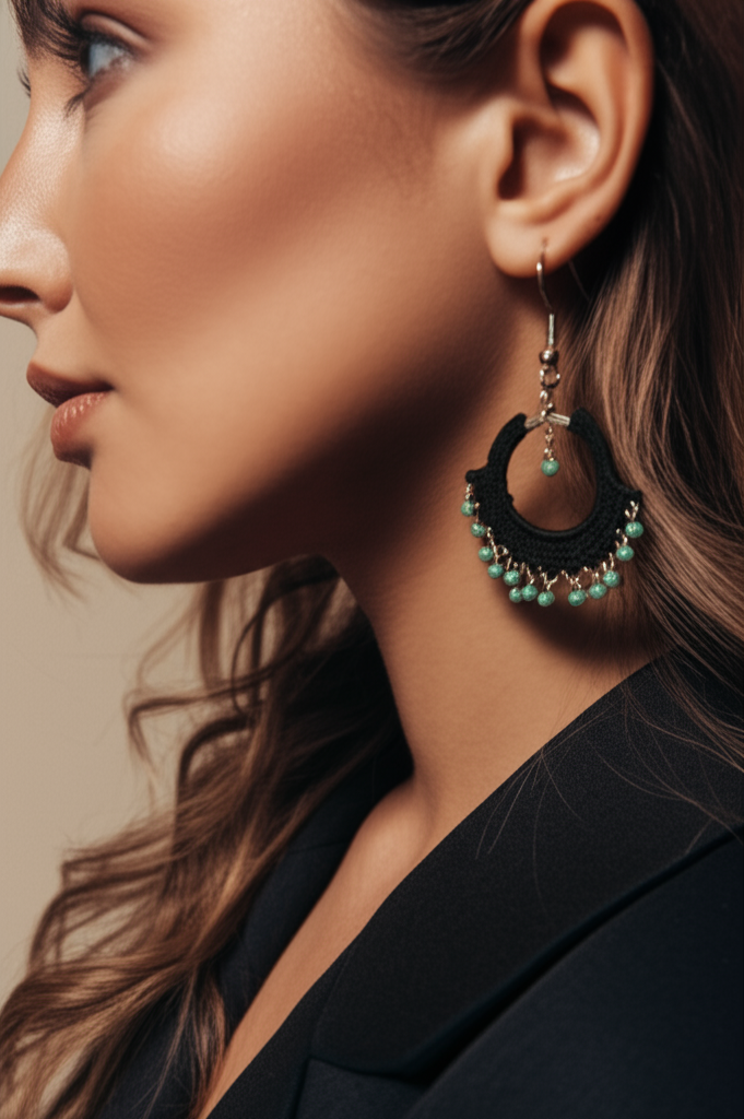 Os brincos Bohemia são a expressão máxima do estilo boho chic. Longos e pendentes, combinam uma argola elegante com croché preto e missangas turquesas, criando um contraste vibrante e sofisticado. A base em aço inoxidável com acabamento prateado assegura durabilidade e conforto, tornando-os perfeitos para uso prolongado.