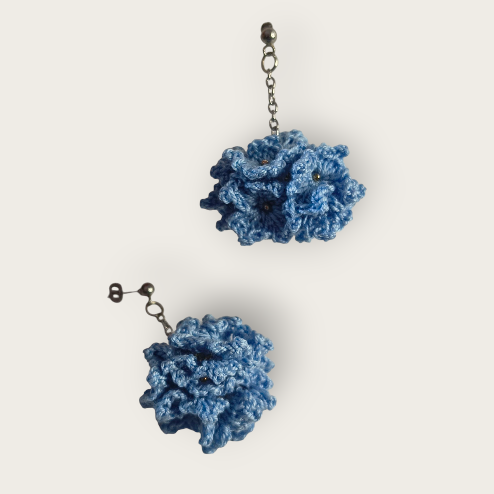 Inspirados na beleza exuberante das hidrângeas, os brincos “Hortênsia” apresentam motivos florais em croché que combinam tons de rosa vibrante ou azul sereno.