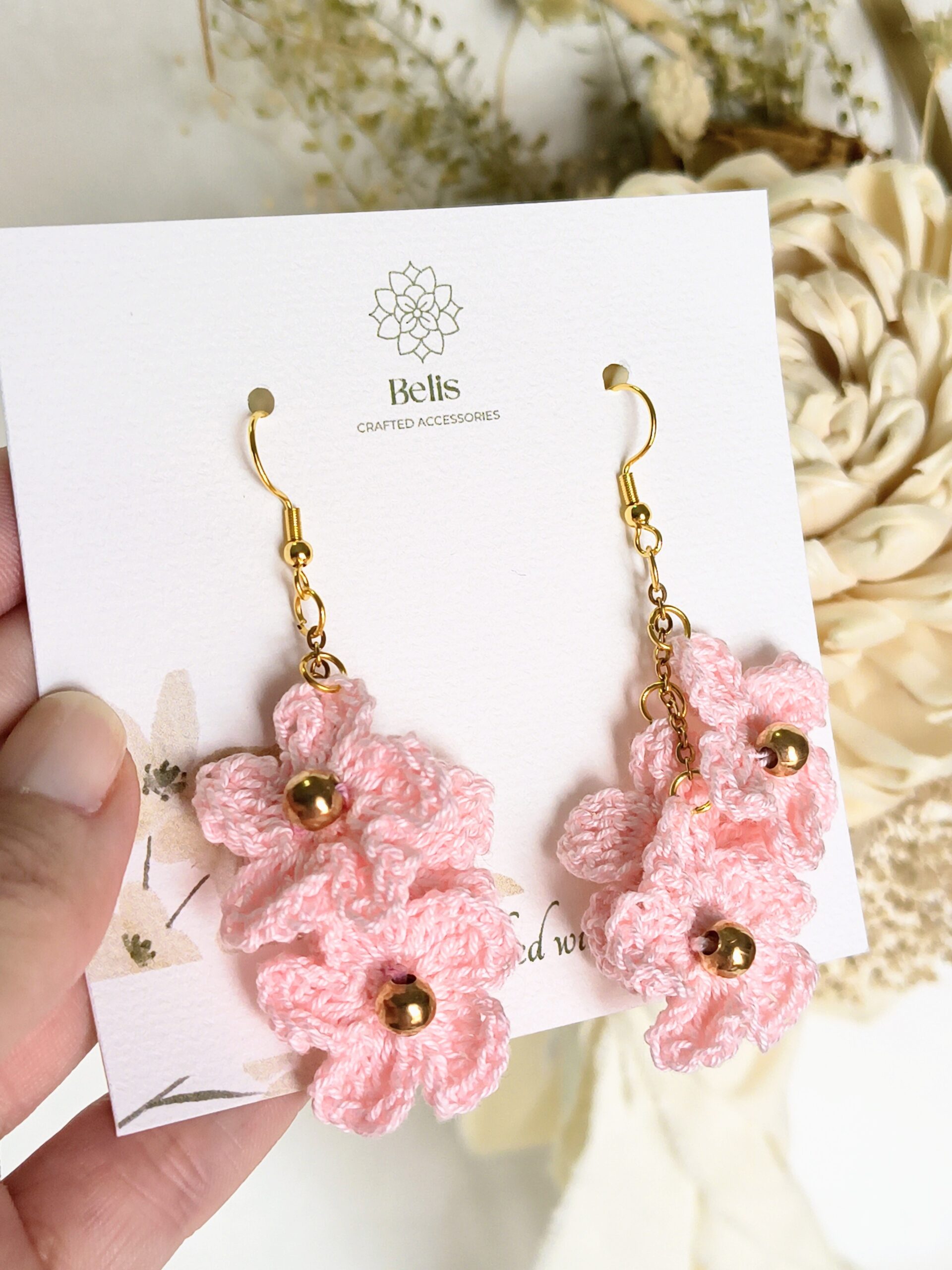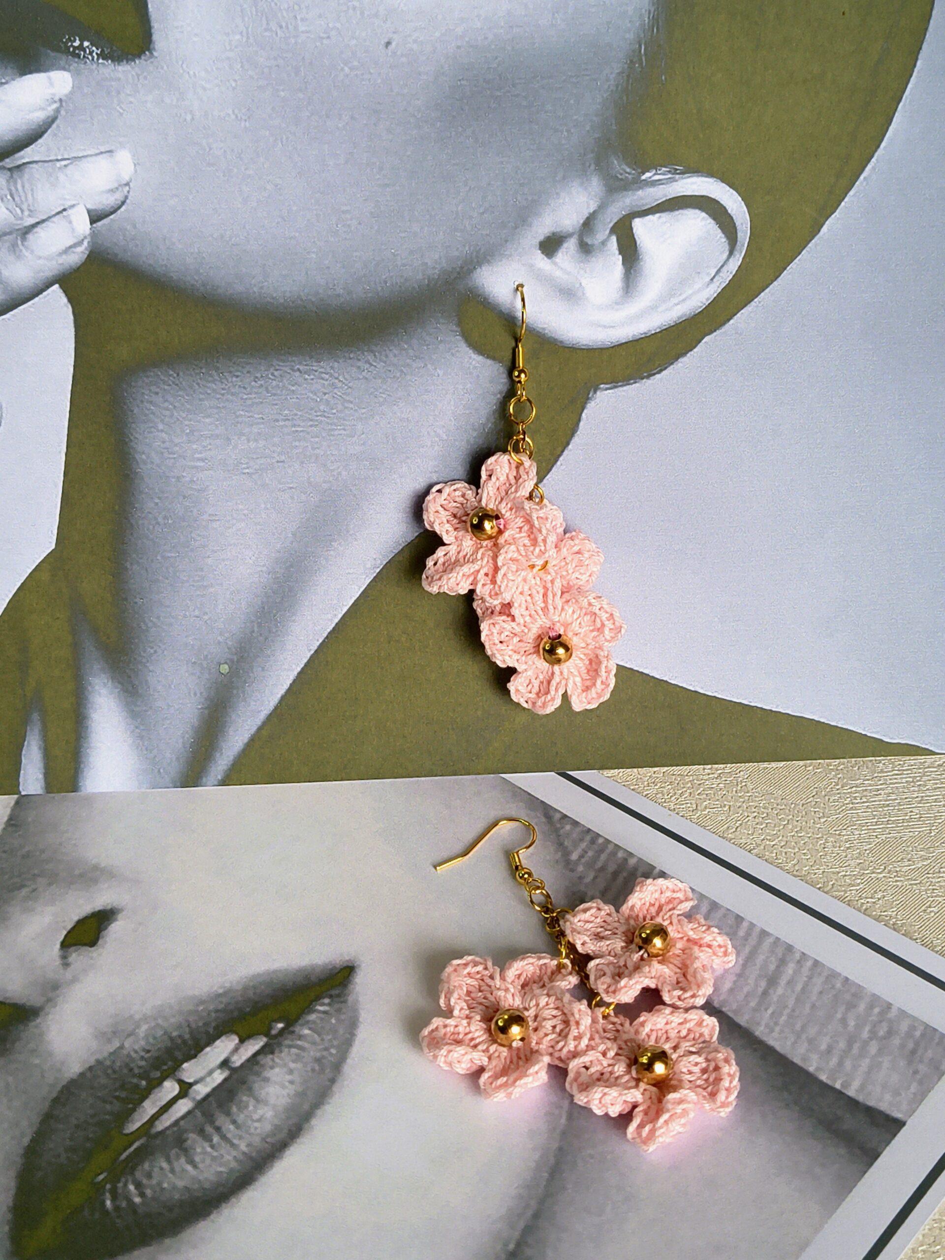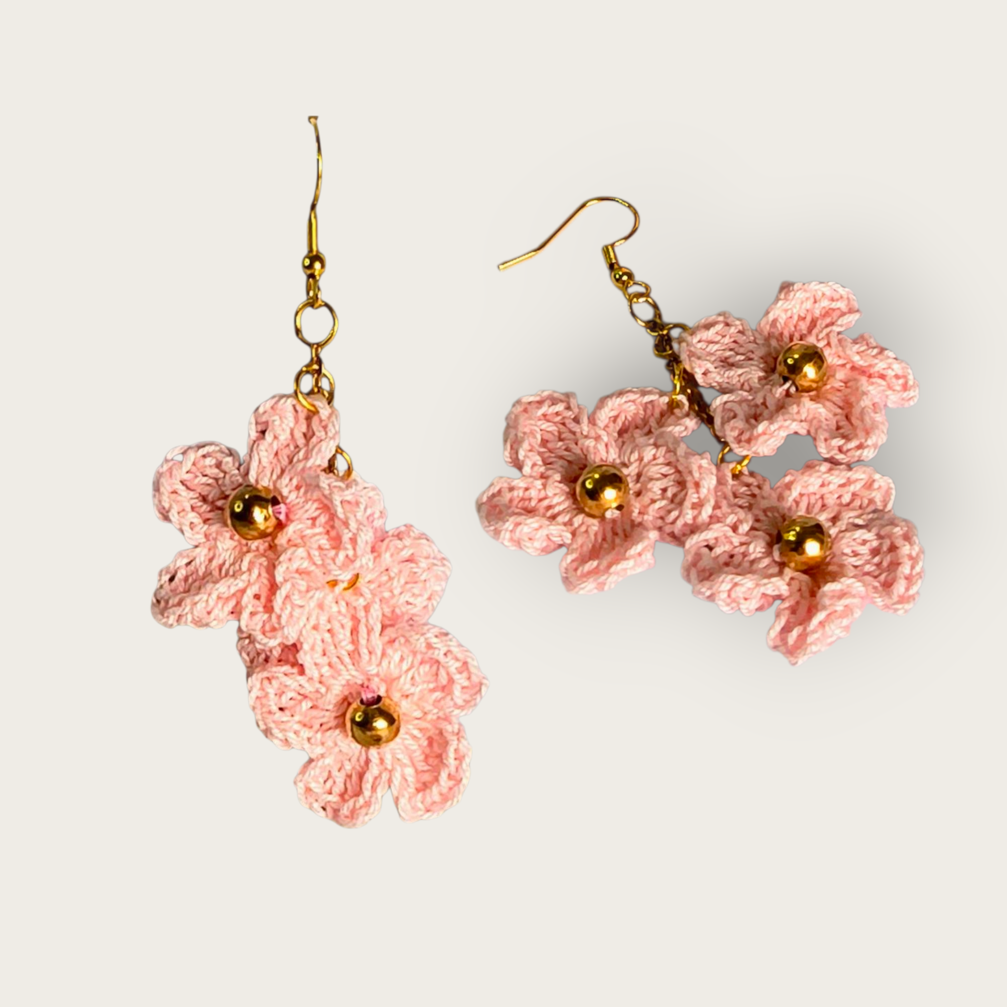 Compostos por três flores de cerejeira em croché, meticulosamente trabalhadas à mão, os Brincos Zephira evocam a natureza em pleno desabrochar. No centro de cada flor, uma pérola metálica dourada acrescenta brilho e sofisticação, lembrando pequenos raios de sol entre as pétalas.