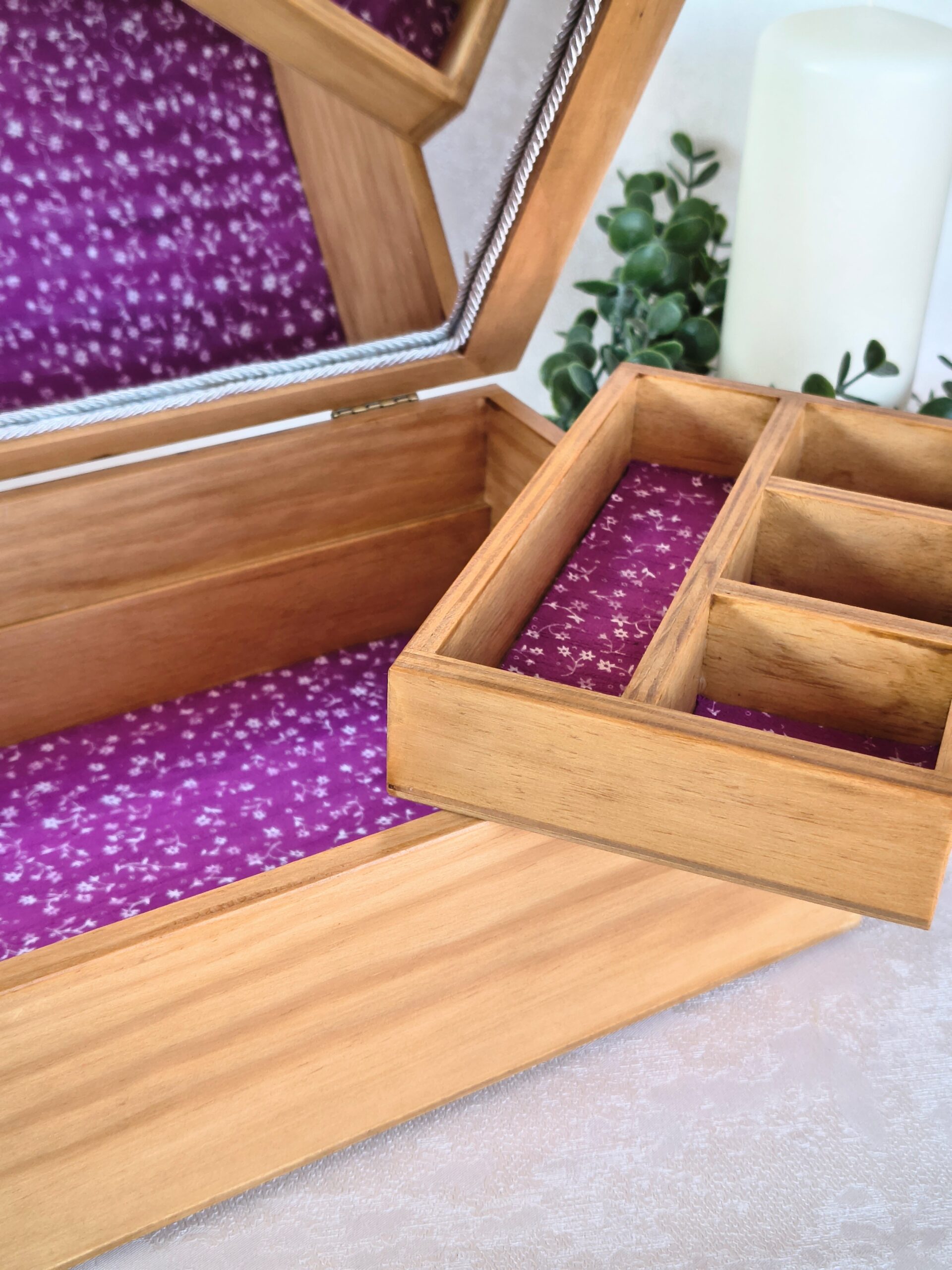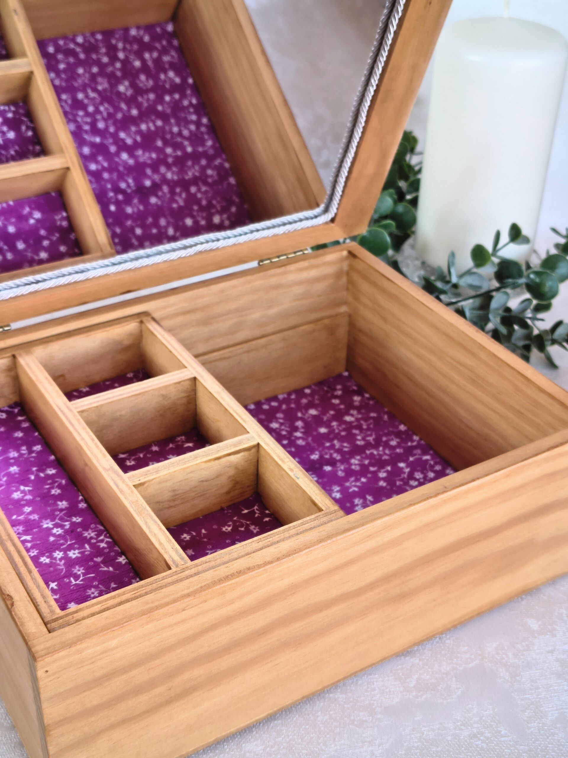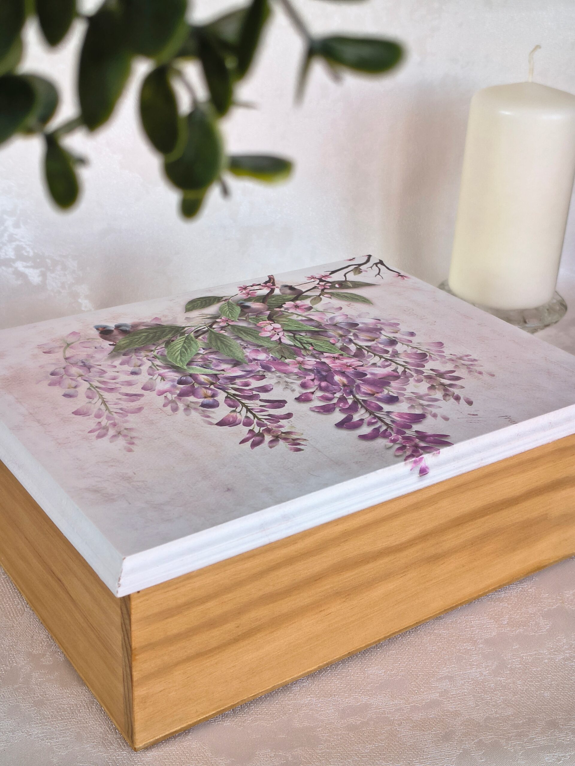 A Caixa Guarda-joias / Maquilhagem Glicínias foi criada para quem procura uma peça versátil, funcional e artística. Esta caixa de madeira envernizada em tom carvalho destaca-se pela tampa decorada em decoupage, apresentando delicadas flores de glicínia acompanhadas por pequenos pássaros — um cenário suave que transmite leveza, feminilidade e elegância. Ao abrir a tampa, descobre-se um espelho integrado, prático para o uso diário, seja ao colocar joias ou maquilhagem.
