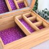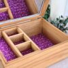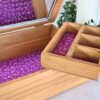 O interior inclui um pequeno tabuleiro móvel, perfeito para dividir acessórios e facilitar o acesso às peças mais utilizadas. Tanto o fundo da caixa como as divisões do tabuleiro são cuidadosamente forrados com tecido, protegendo cada objeto com carinho. Os pés de feltro mantêm a caixa estável e preservam as superfícies onde repousa.