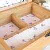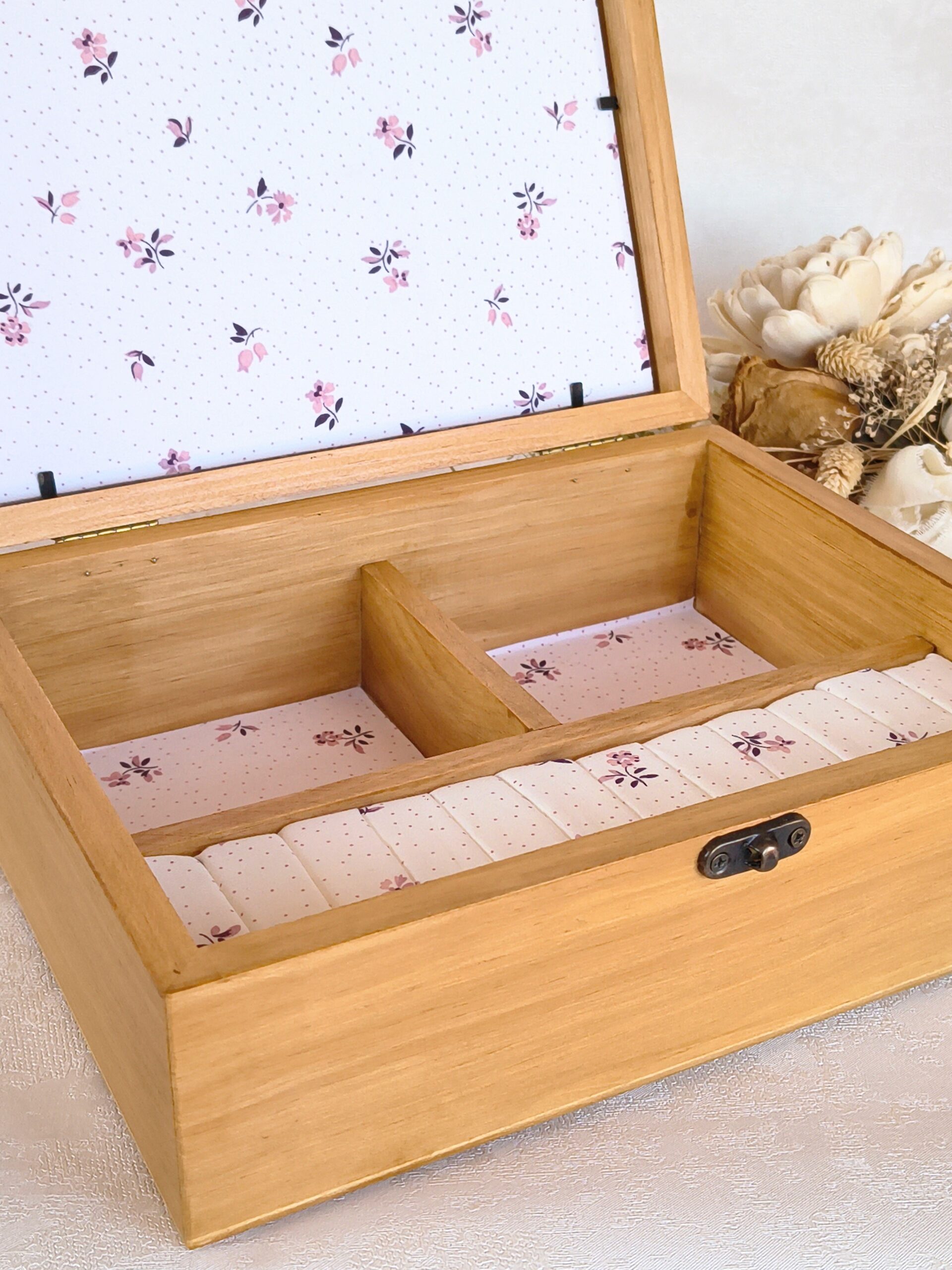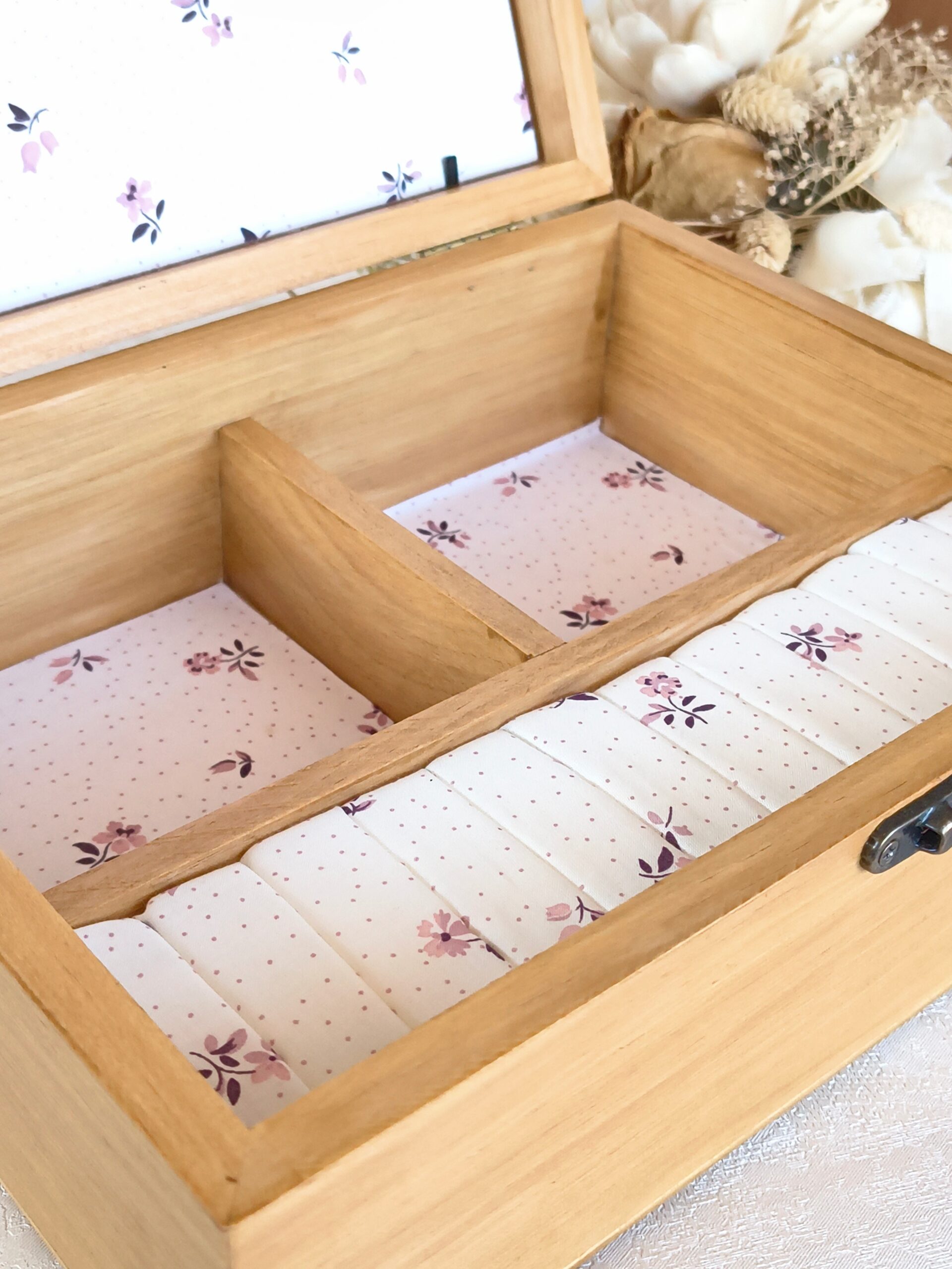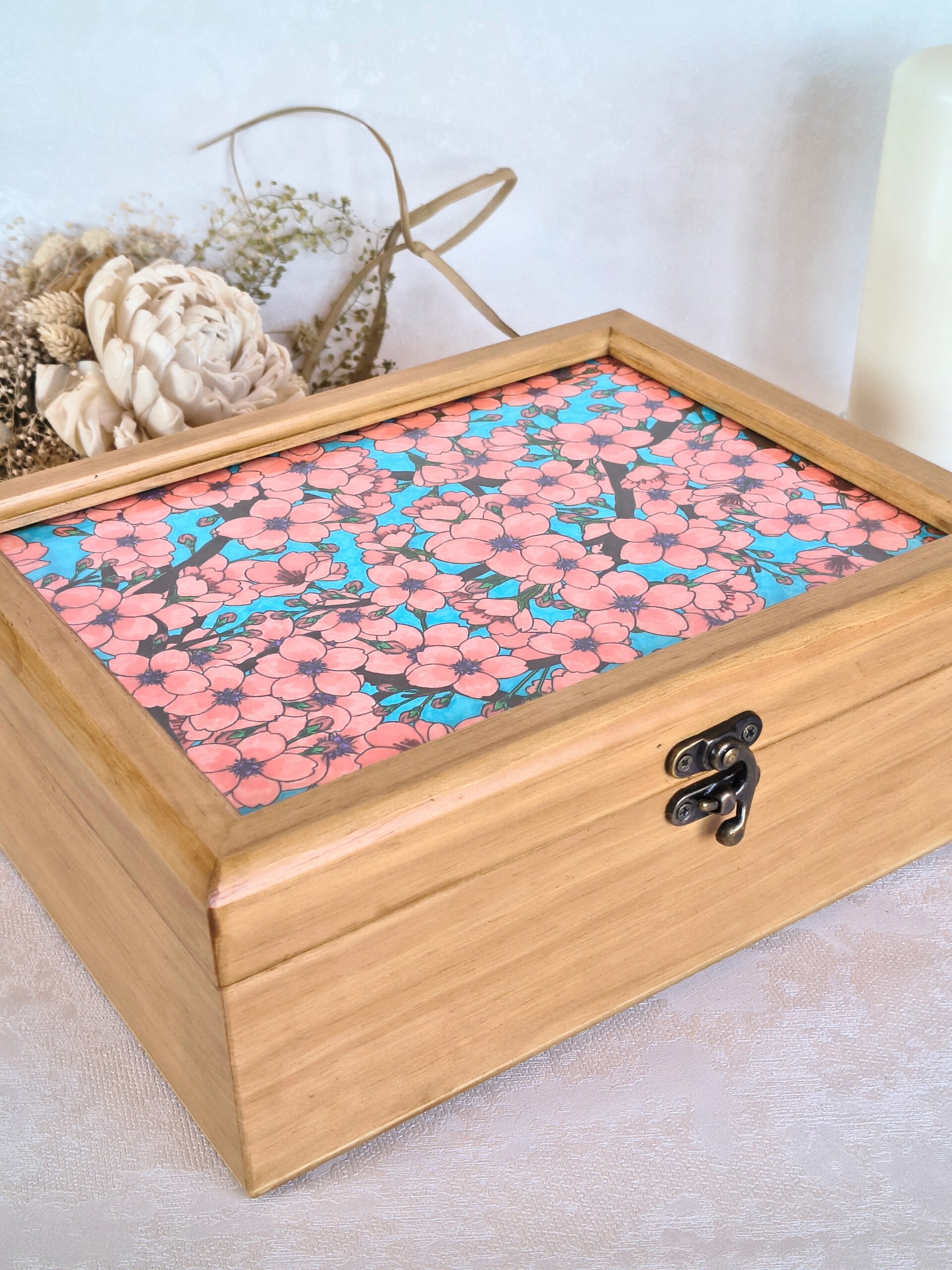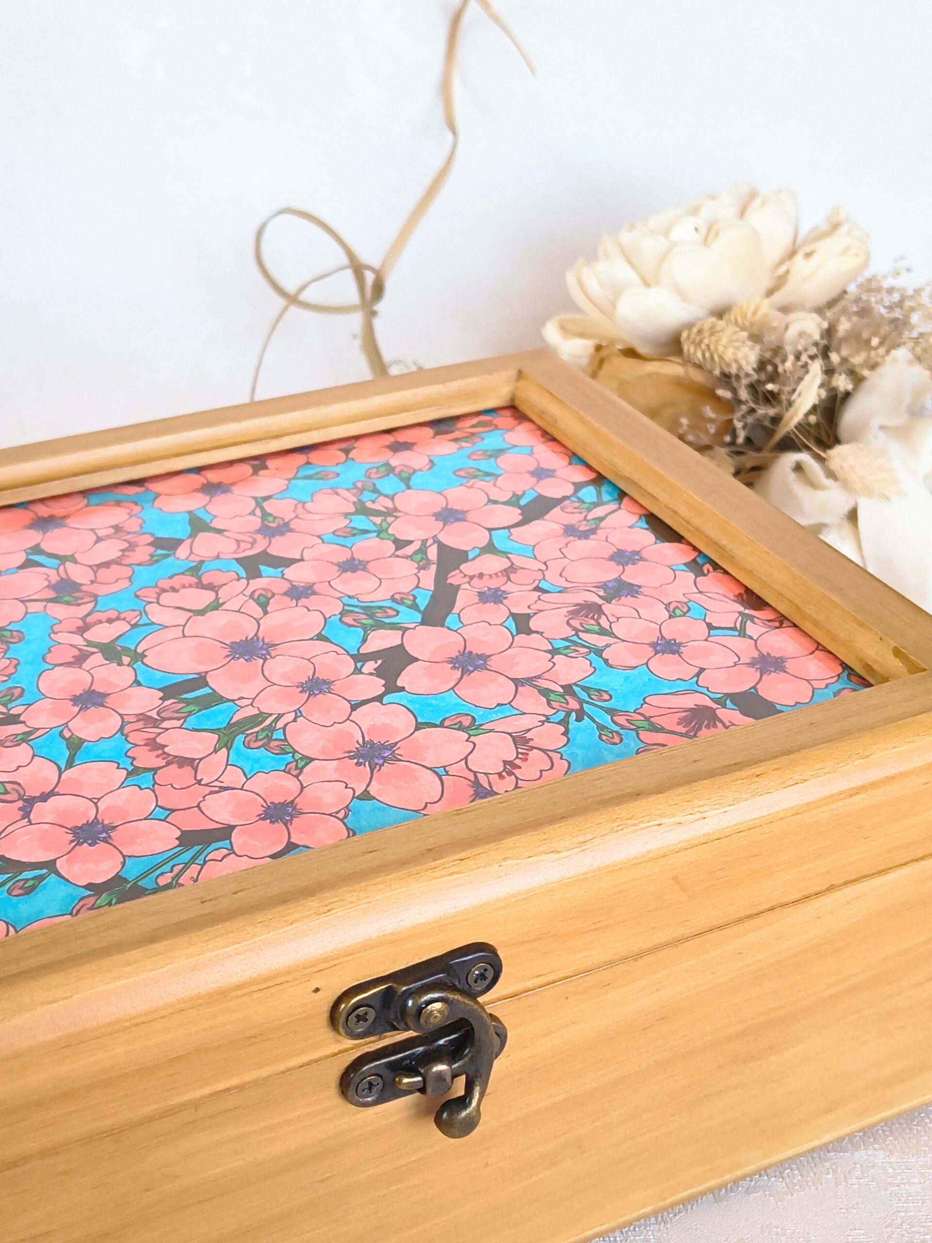 A Caixa Guarda-joias Sakura é uma peça delicada que evoca a serenidade e a poesia das flores de cerejeira — símbolo de renovação, esperança e beleza efémera. Produzida em madeira envernizada com acabamento em tom carvalho, apresenta na tampa de vidro uma ilustração encantadora que remete para a primavera japonesa. Ao abrir, o encanto continua: o interior da tampa é forrado com tecido estampado com pequenas flores, reforçando o espírito romântico e artesanal da peça.