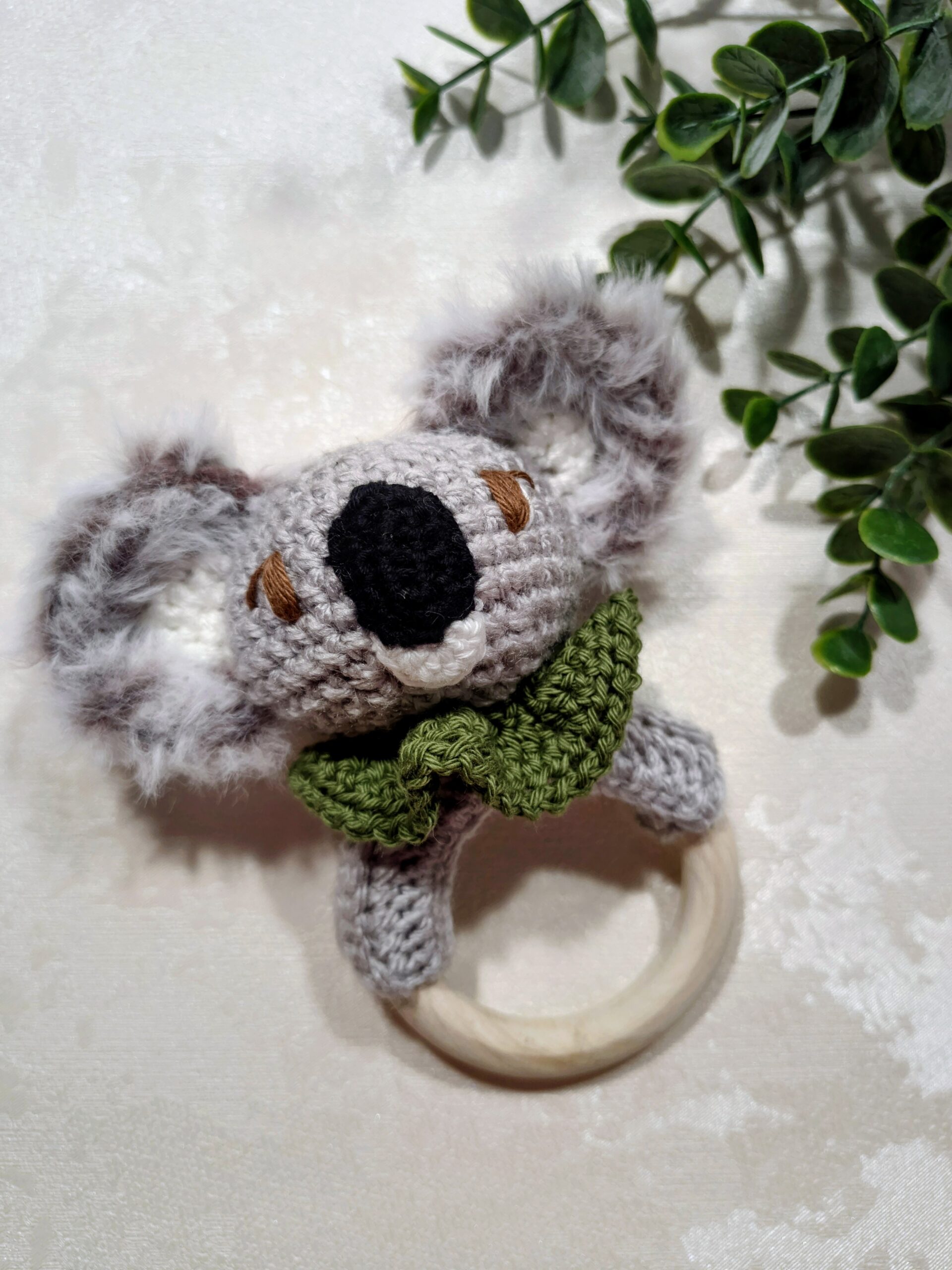 Com um anel de dentição em madeira natural, cuidadosamente polido e suave ao toque, é ideal para aliviar o desconforto das gengivas durante a fase de dentição. No topo, o adorável Coala Ollie em amigurumi transforma este acessório num pequeno companheiro de exploração, estimulando a curiosidade e a motricidade fina.