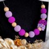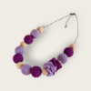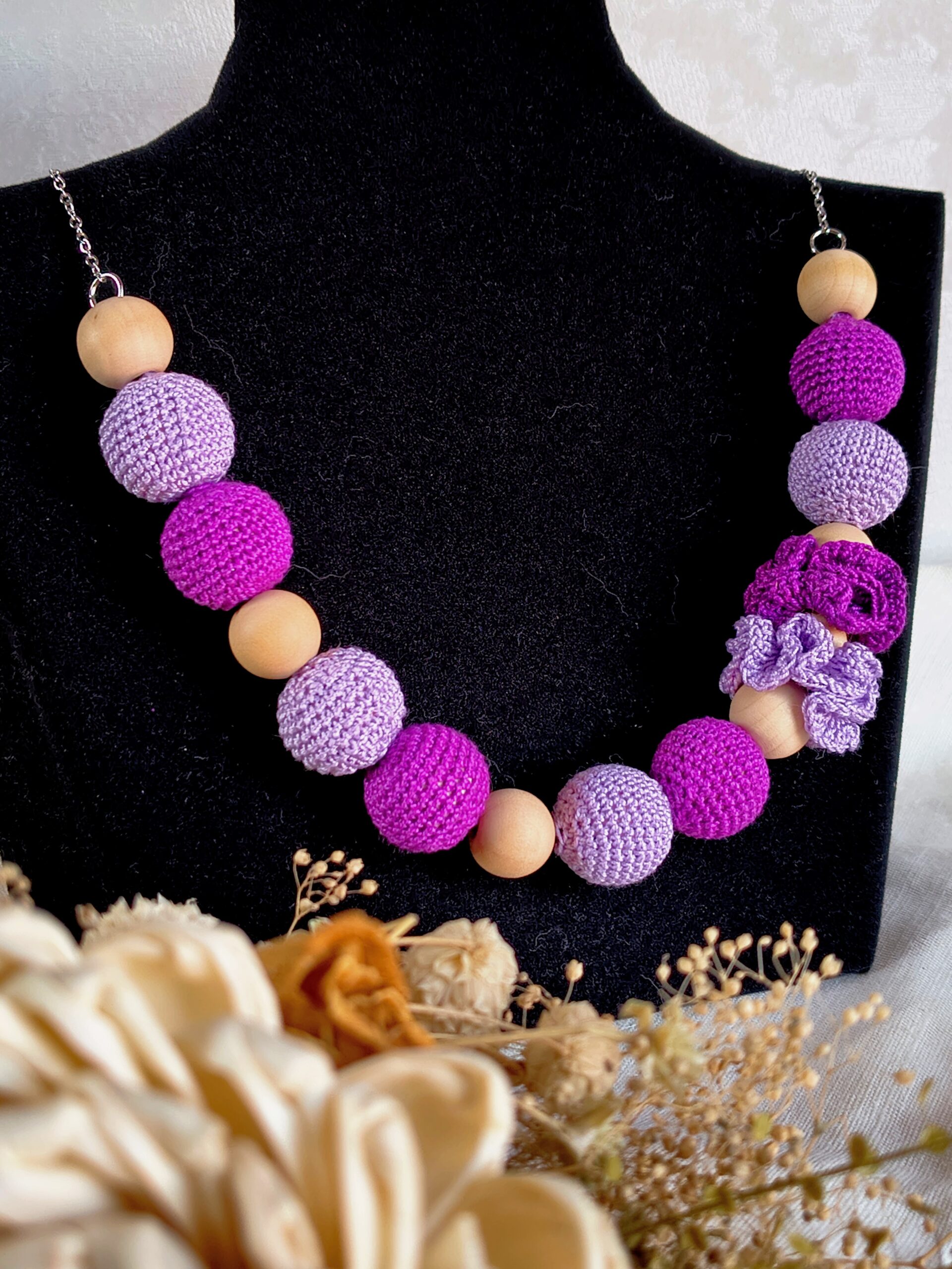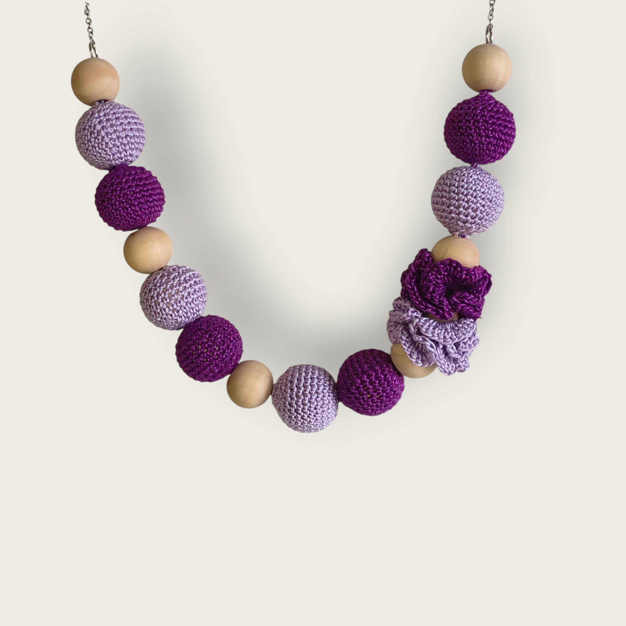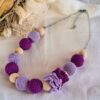 O colar Aconchego foi desenhado para mulheres que valorizam conforto, delicadeza e originalidade. Com fio de aço inoxidável prateado (50-55cm), apresenta contas de madeira natural e contas forradas em croché, complementadas por dois mini puff laterais em lilás/roxo que conferem um detalhe único e distintivo.