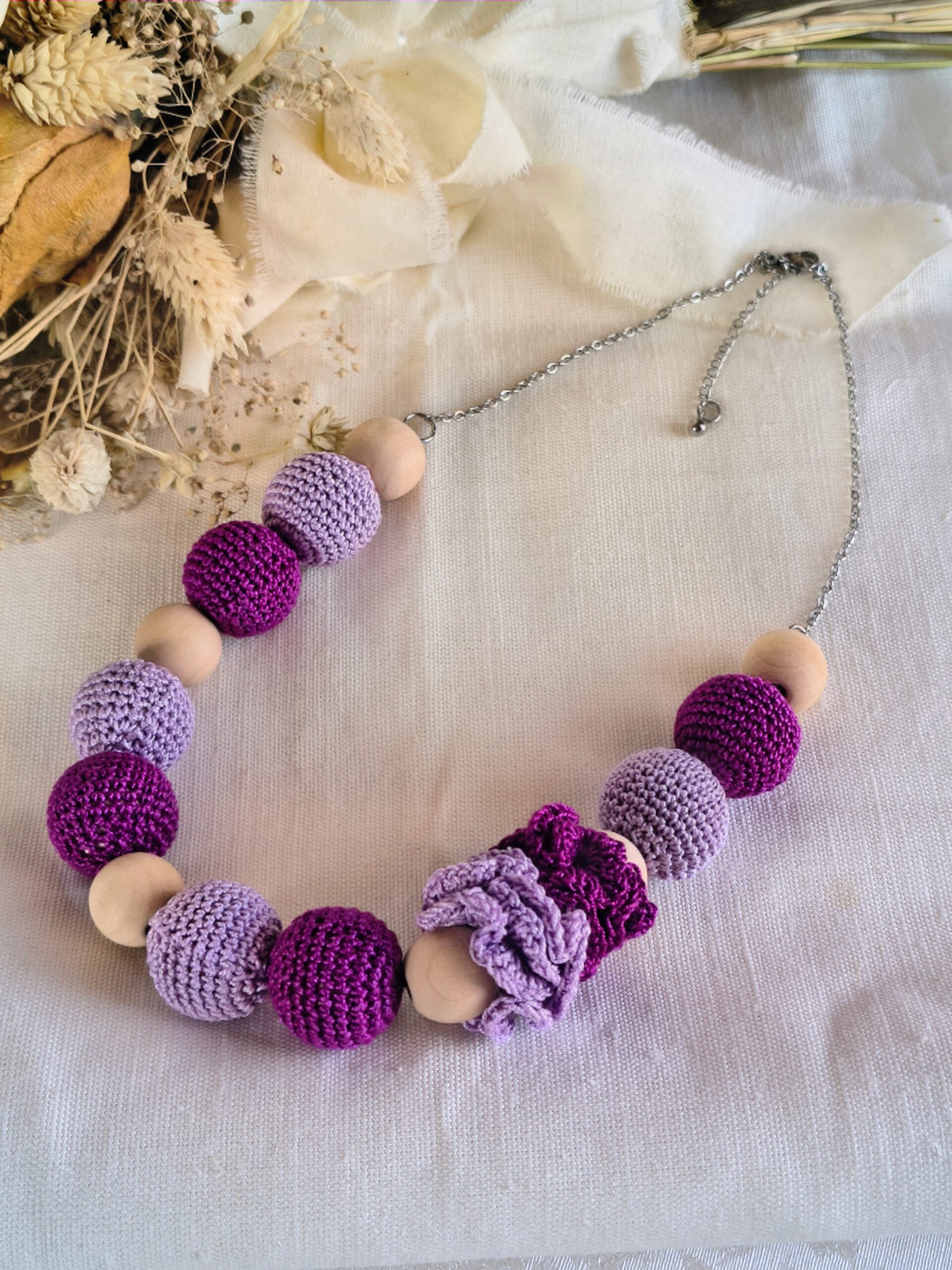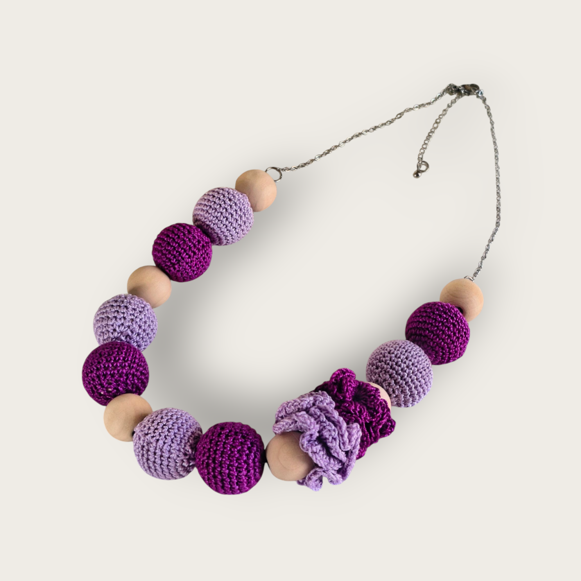 O croché artesanal acrescenta textura e leveza à peça, enquanto a combinação de madeira natural e cores suaves cria um equilíbrio perfeito entre elegância e descontração. O fio de aço inoxidável garante durabilidade e conforto, tornando o colar ideal para uso diário ou em ocasiões especiais.