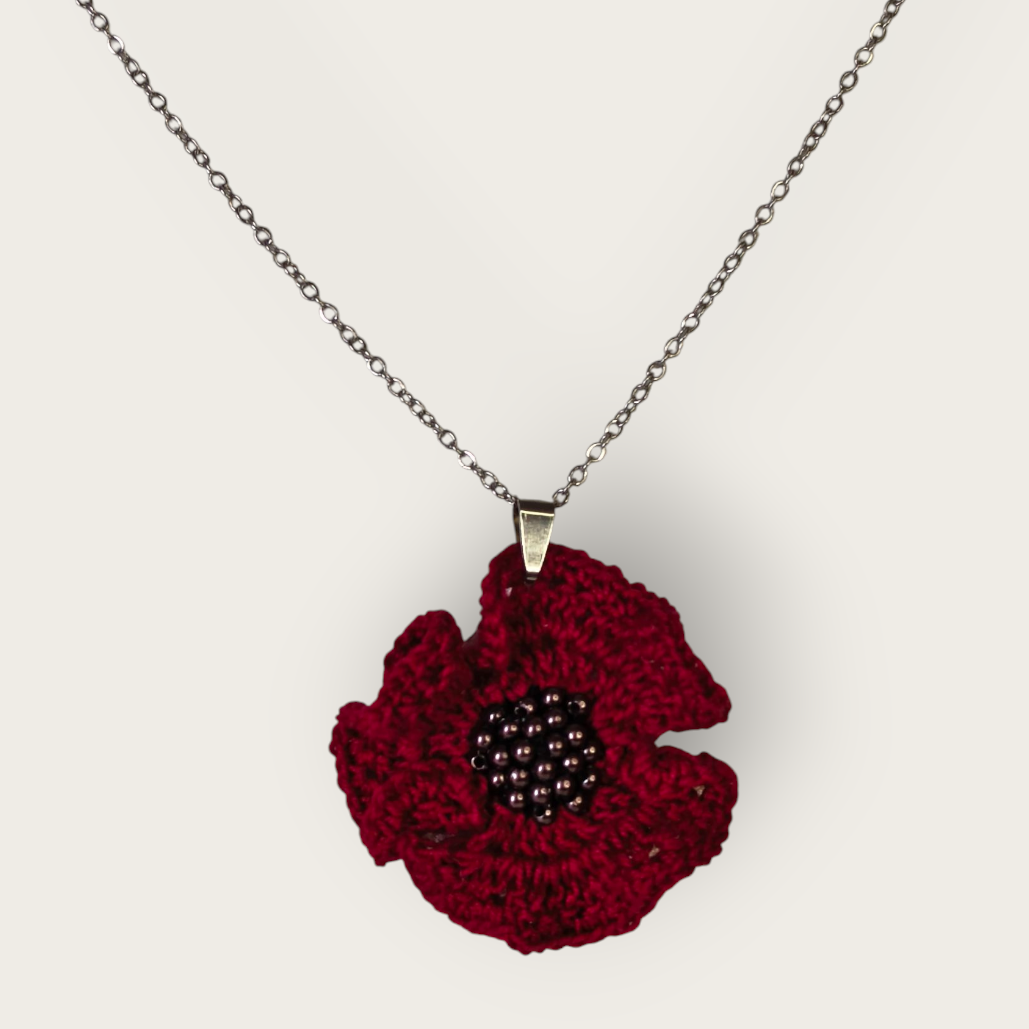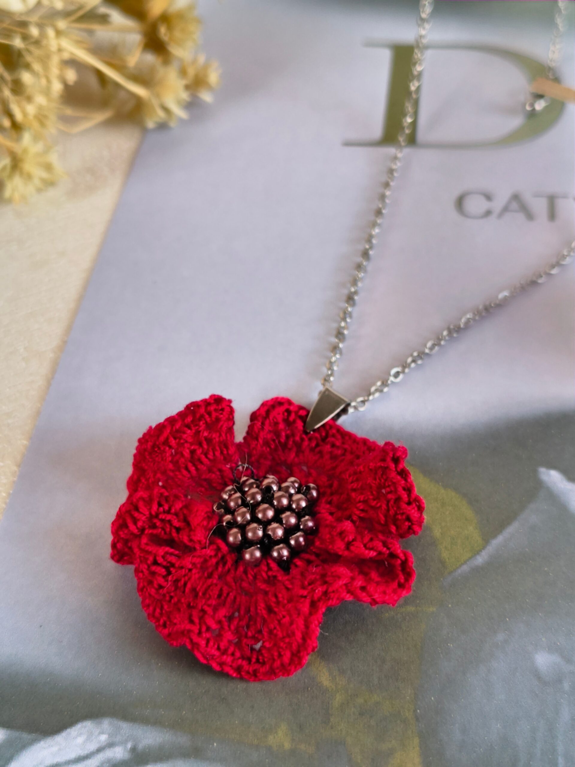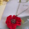 O colar Papoila de Flandres é um tributo à beleza natural e ao artesanato delicado. Com fio de aço inoxidável prateado (40-45cm), apresenta como protagonista uma grande papoila em croché de algodão, adornada com missangas que acrescentam brilho e realismo.