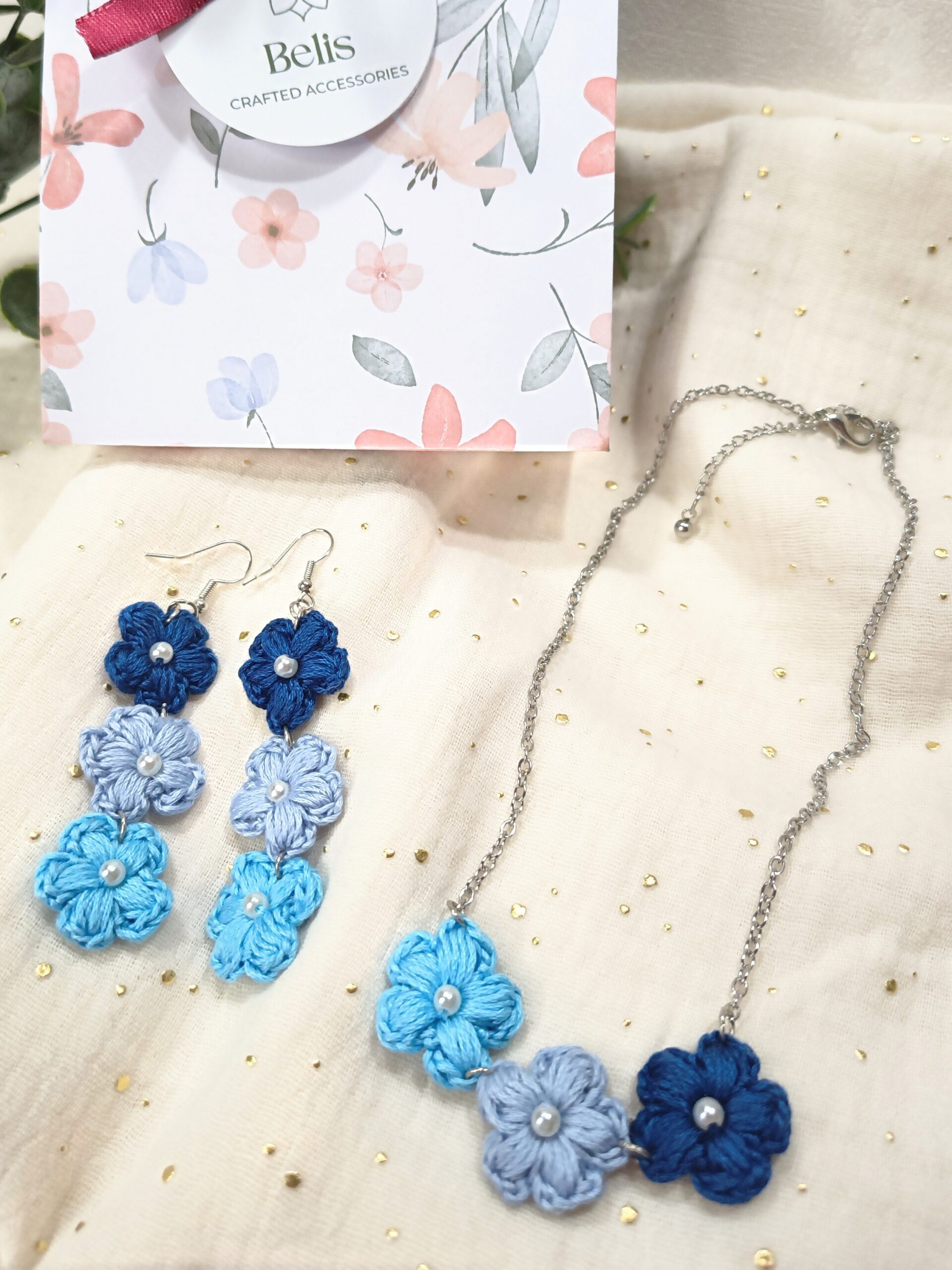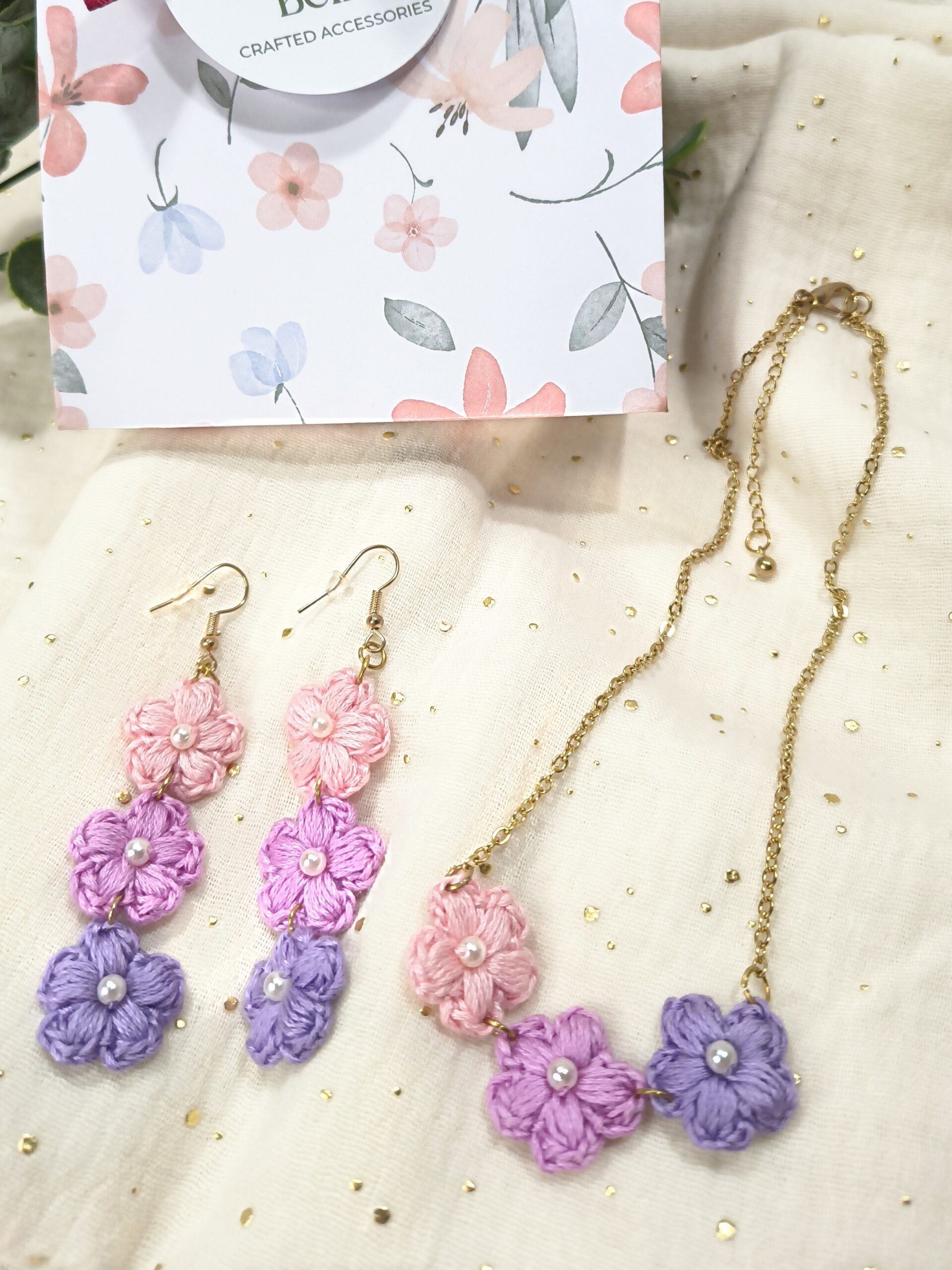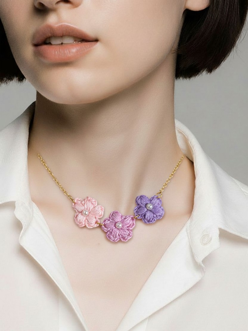 O Colar “Flores ao Vento” complementa o conjunto com harmonia. Composto por três flores em croché artesanal, cada uma também com centro em pérola, é uma peça encantadora que valoriza o decote de forma suave e feminina. A corrente possui comprimento ajustável entre 43 e 48 cm, com fecho tipo mosquetão e extensão, garantindo um ajuste perfeito.