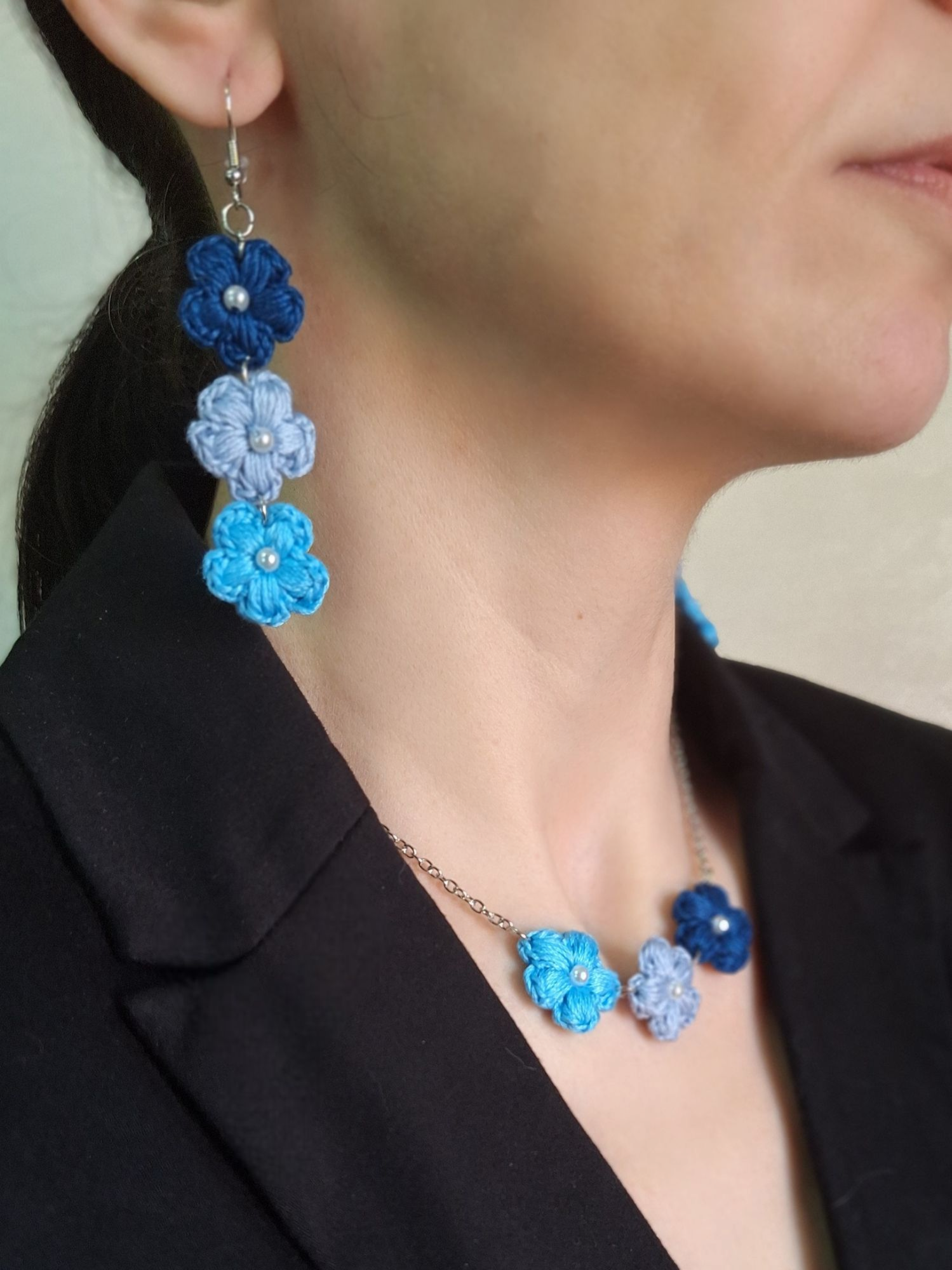 Os Brincos “Flores ao Vento” apresentam pequenas florzinhas em croché alinhadas verticalmente, criando um efeito alongado e elegante. Cada flor é finalizada com uma pérola central, que acrescenta brilho subtil e um toque clássico ao design. Com comprimento aproximado de 9 cm, são leves, confortáveis e ideais para destacar o rosto com delicadeza.