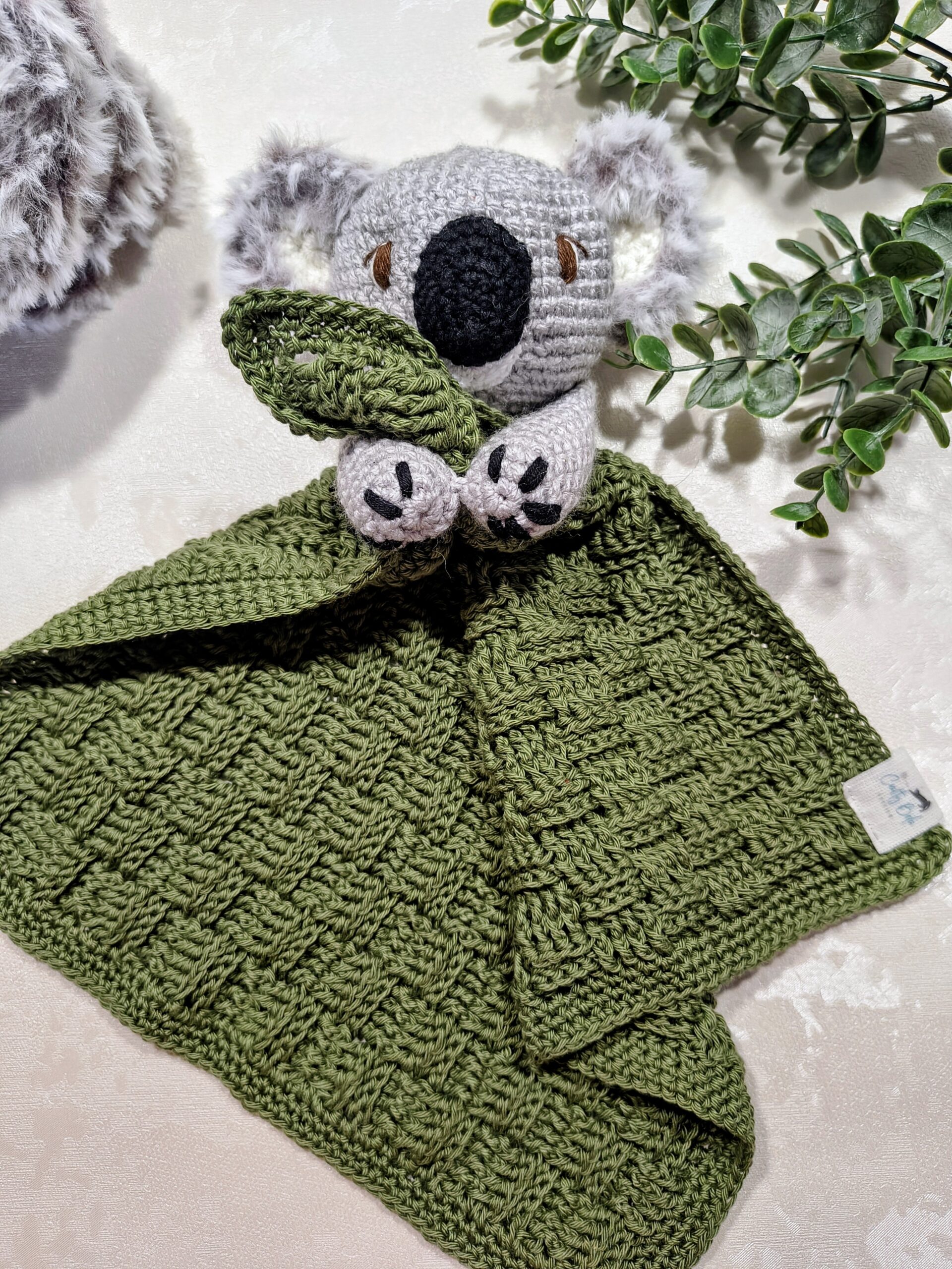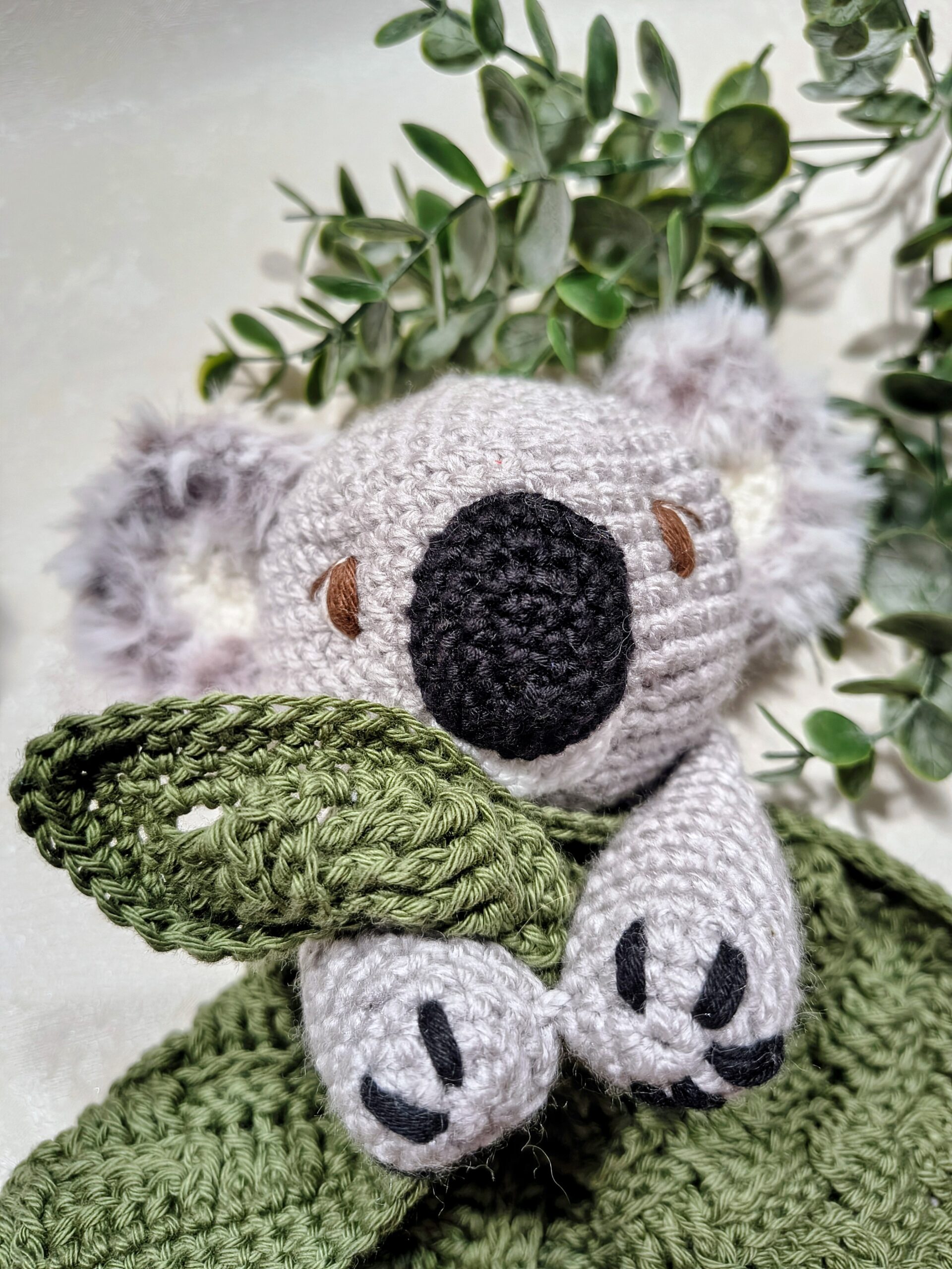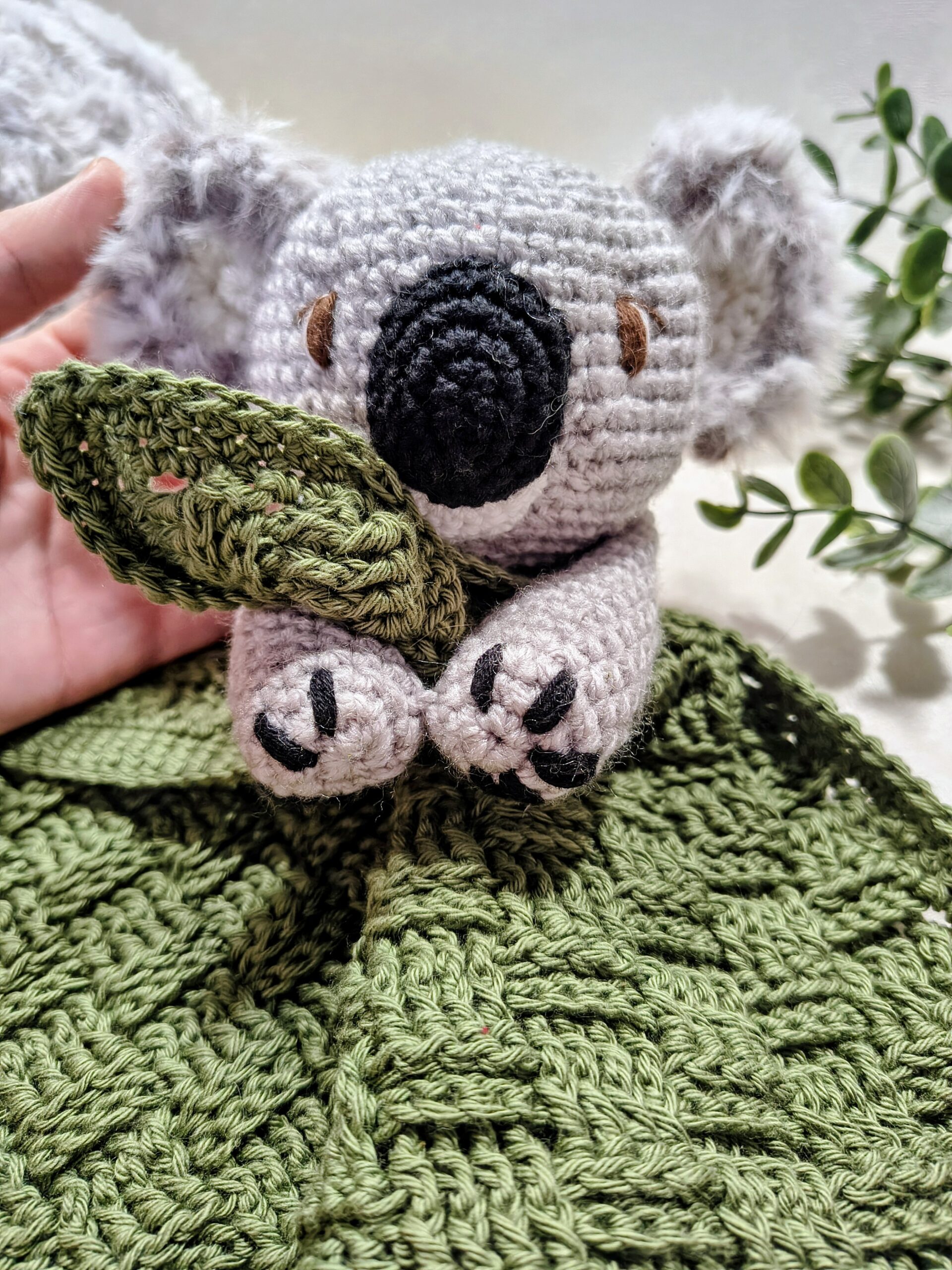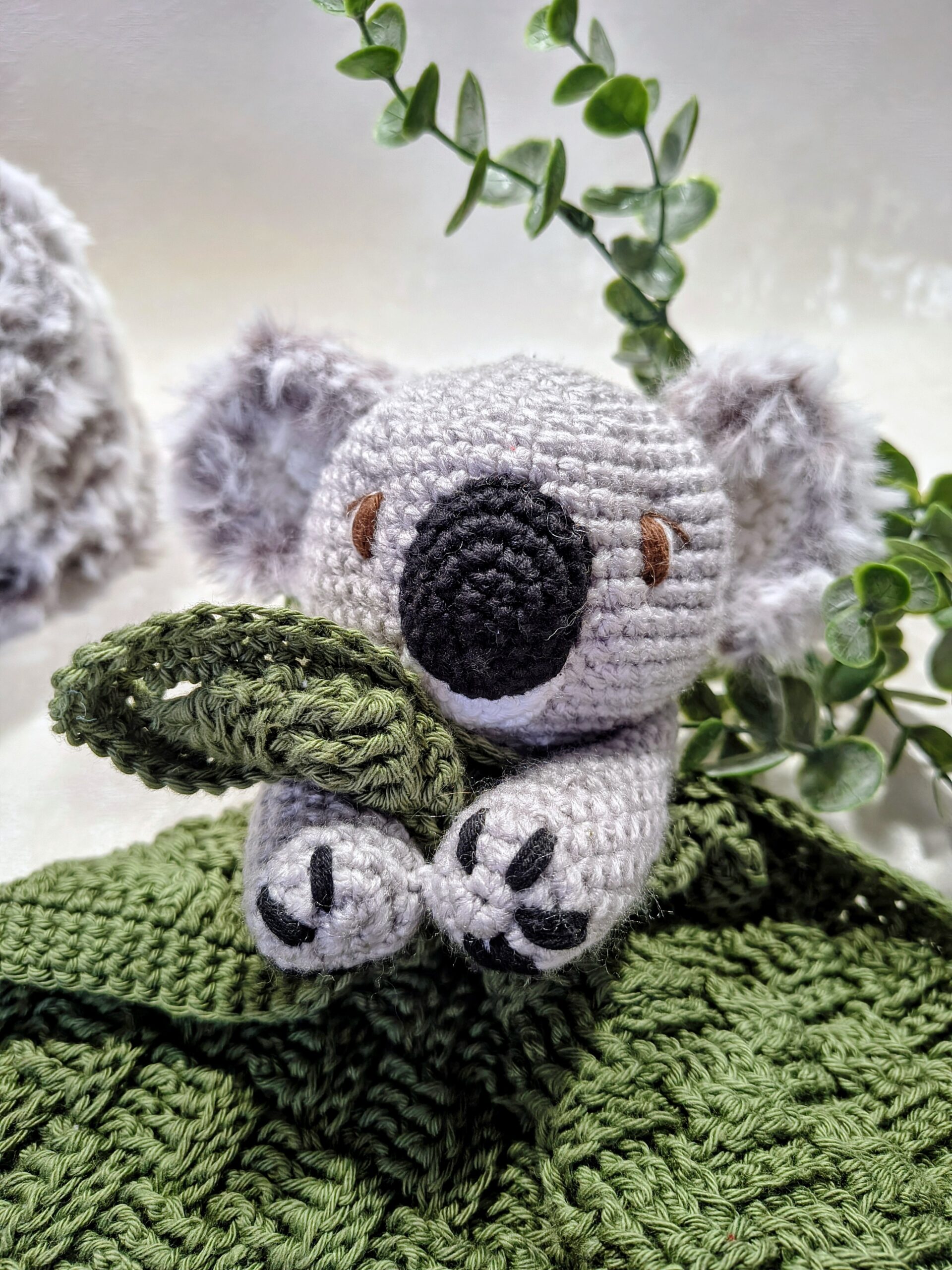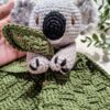 O paninho, em croché com fio de algodão, mede aproximadamente 34×34 cm e oferece uma textura delicada e respirável, ideal para a pele sensível do bebé. O adorável Coala Ollie em amigurumi convida ao aconchego e à ligação emocional, tornando-se rapidamente um companheiro inseparável nas sestas e na hora de dormir.