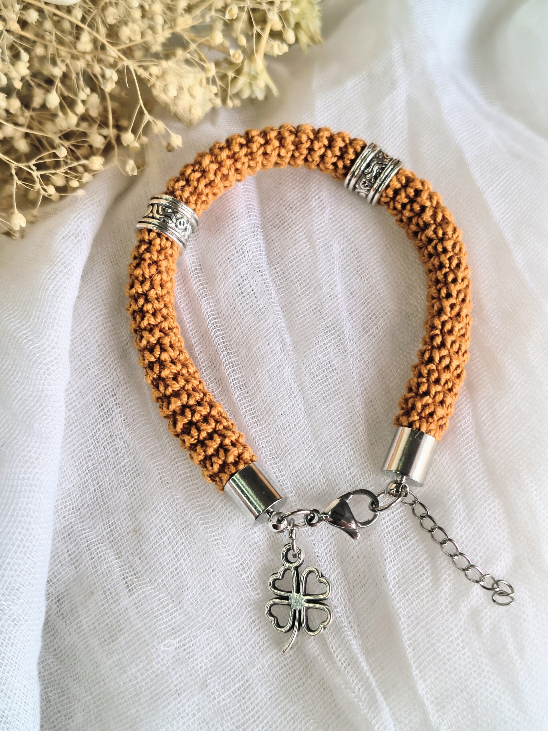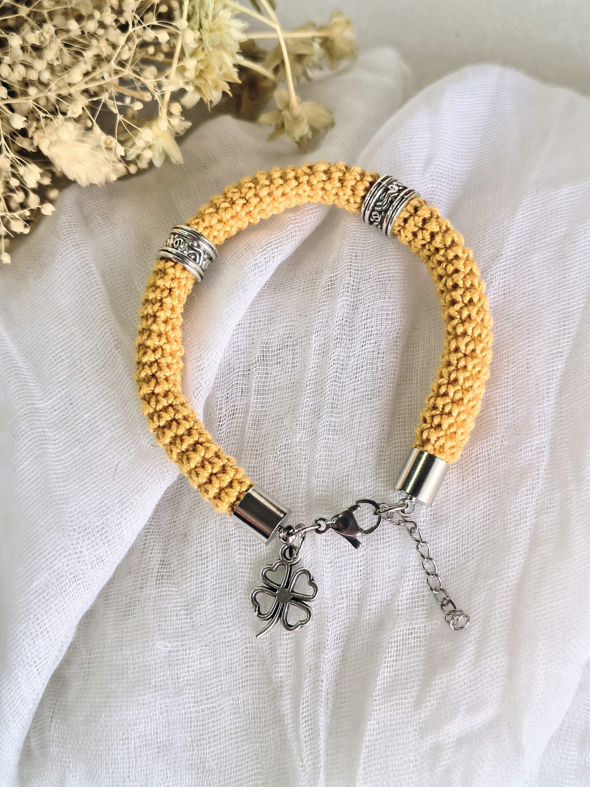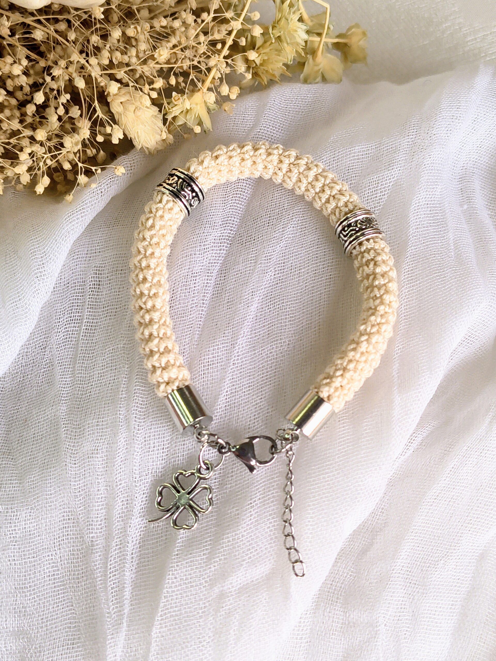 Um pequeno pendente em forma de trevo completa o design trazendo um toque simbólico de sorte e boas vibrações. De tamanho único (18 cm + 3 cm de extensão), adapta-se facilmente ao pulso.
