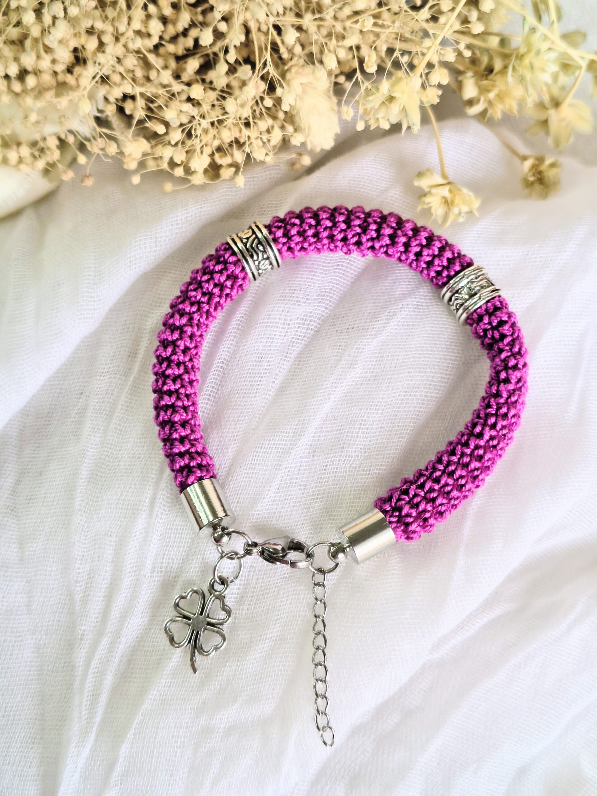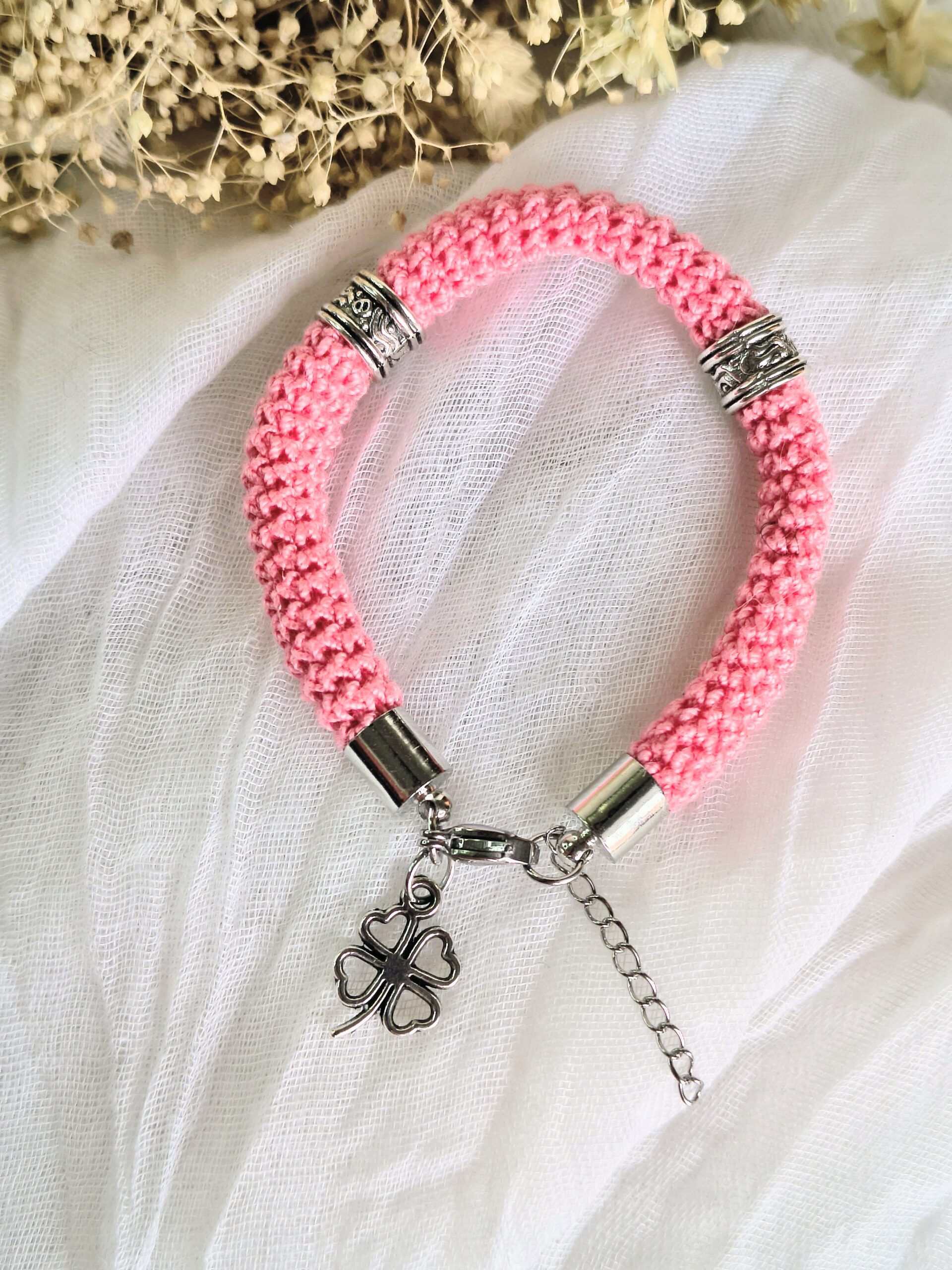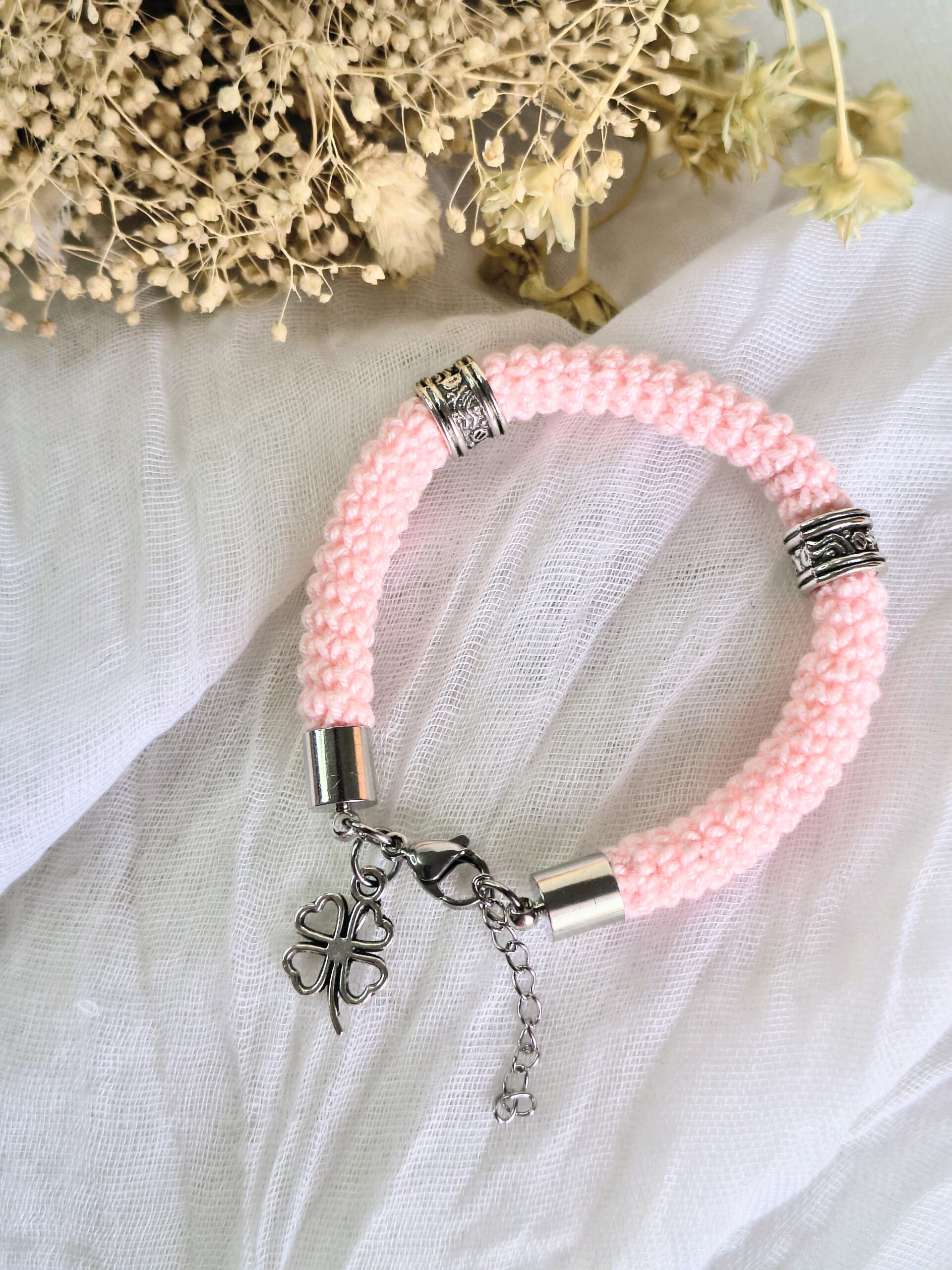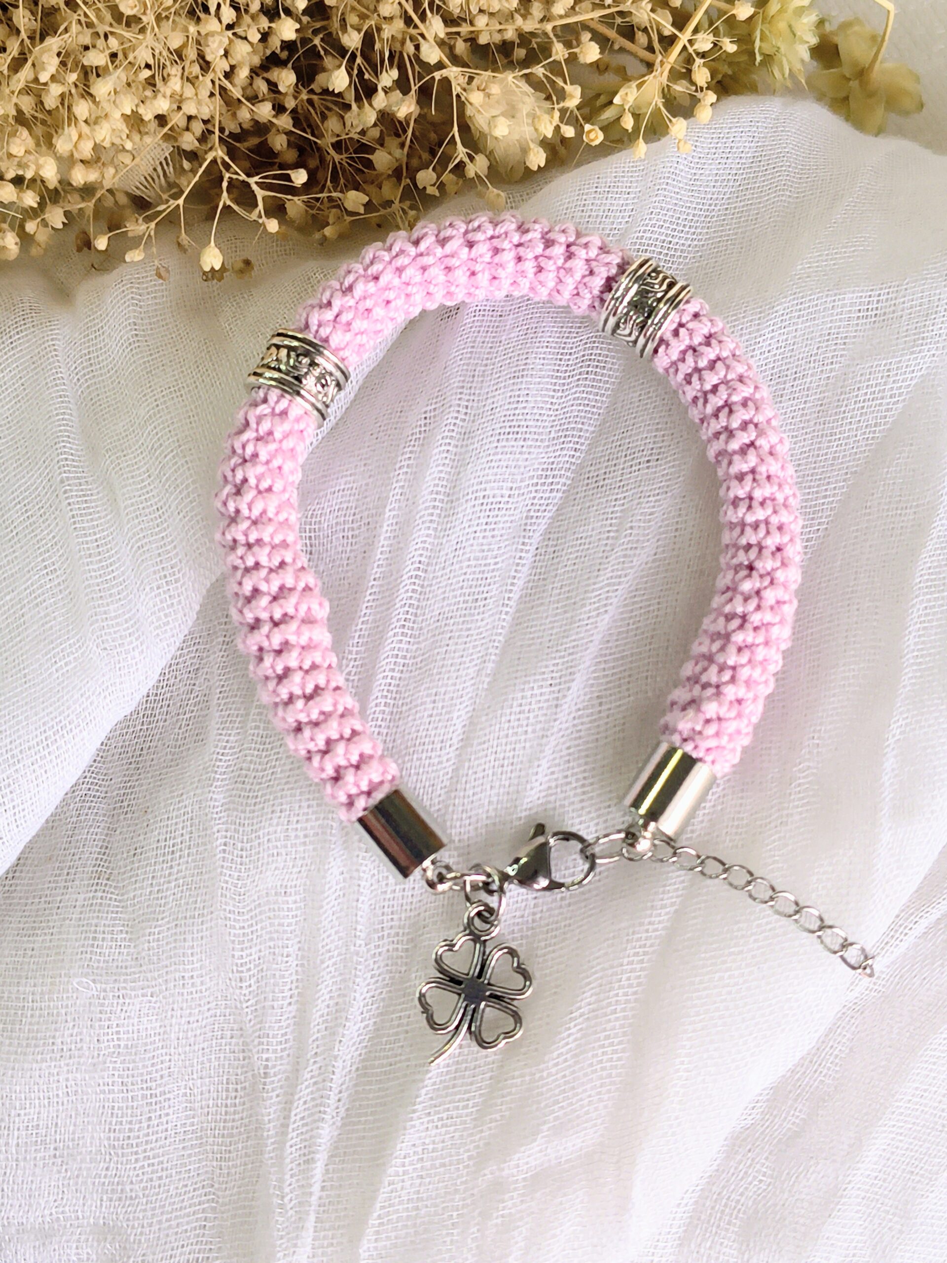 Um pequeno pendente em forma de trevo completa o design trazendo um toque simbólico de sorte e boas vibrações. De tamanho único (18 cm + 3 cm de extensão), adapta-se facilmente ao pulso.